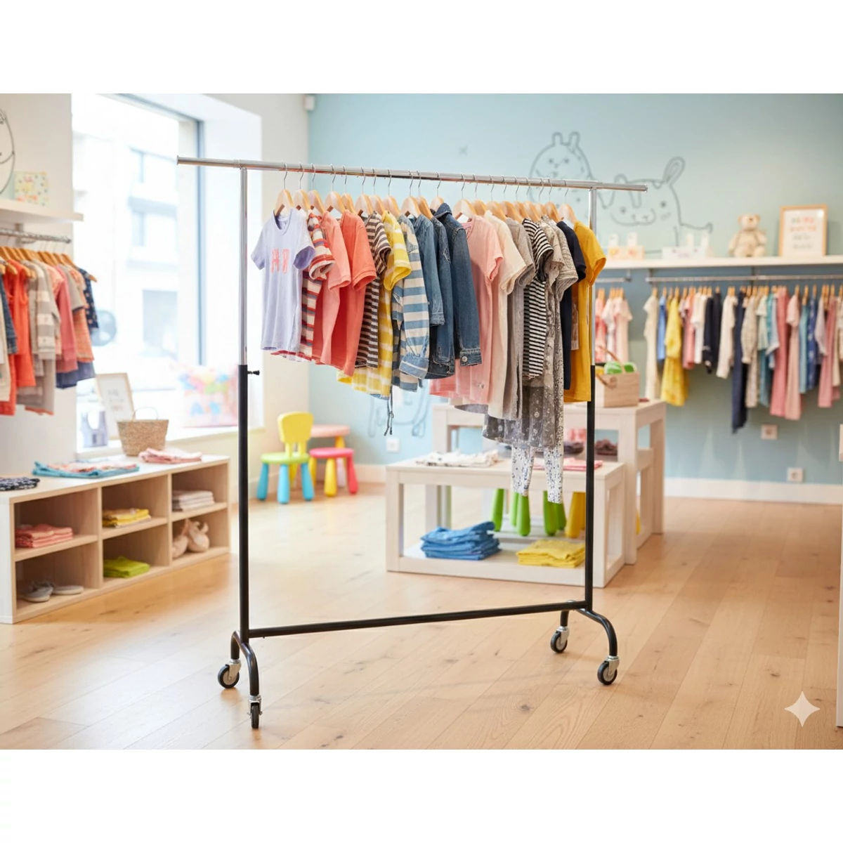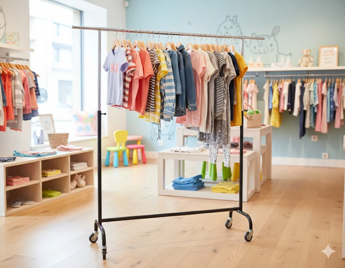 Egy sokoldalú, nagy kapacitású ruhatároló állvány, amely tökéletes választás üzletekbe, bemutatótermekbe vagy akár otthoni gardróbrendszerekbe. Az állvány 1500 mm szélességével jelentős akasztófelületet kínál, 570 mm-es mélysége pedig kiváló stabilitást biztosít még nagyobb ruha- vagy textilmennyiség tárolásakor is.
