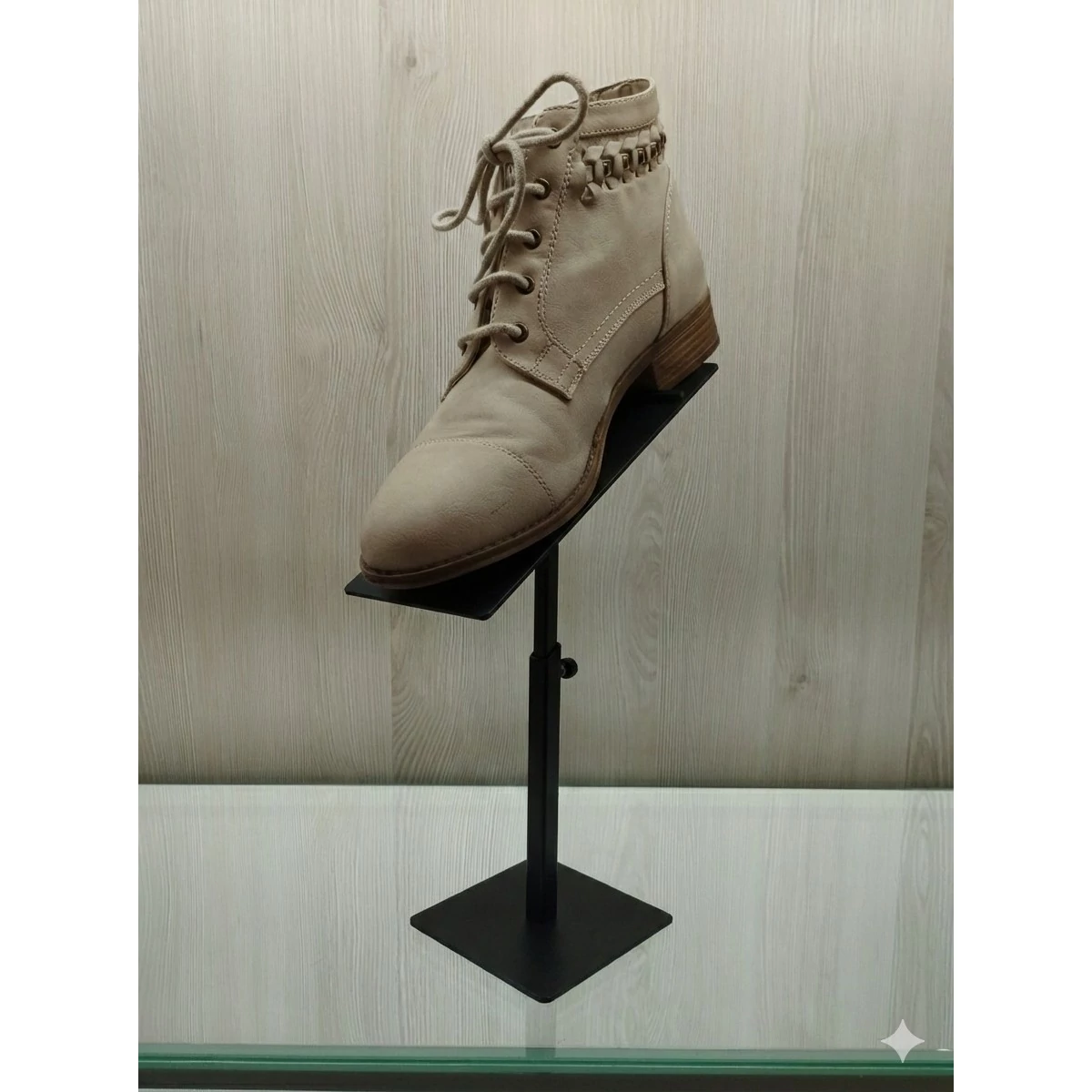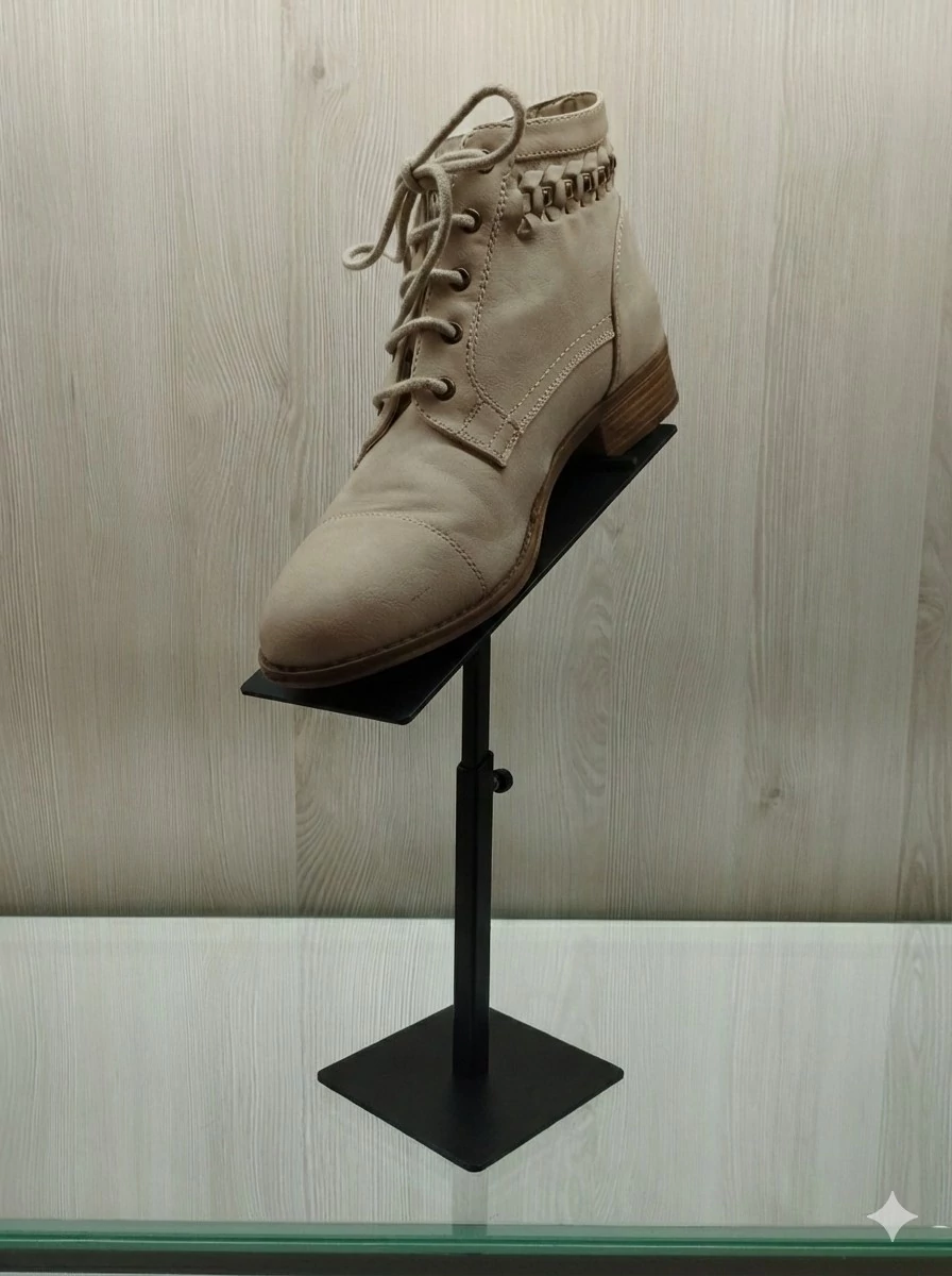 Ez a cipőtartó elegáns fém kivitelével azonnal megragadja a figyelmet. Letisztult vonalai és modern megjelenése bárhova tökéletesen beilleszthető, legyen szó üzlethelyiségről, vagy akár egy kiállításról. Az erős, strapabíró anyagnak köszönhetően hosszú ideig megbízhatóan használható, miközben mindig kifogástalan látványt nyújt. Az álló kialakítás lehetővé teszi, hogy cipőidet szemmagasságban vagy kirakatokban, kiemelt helyen prezentáld, így ügyfeleid számára azonnal észrevehető és vonzó lesz minden darab. Asztalra helyezve pedig tökéletes megoldás a kisebb boltok, üzletterek vagy akár vásárok és rendezvények számára, ahol fontos a hordozható, könnyen elhelyezhető bemutatási eszköz.