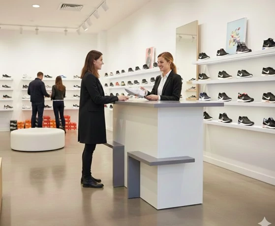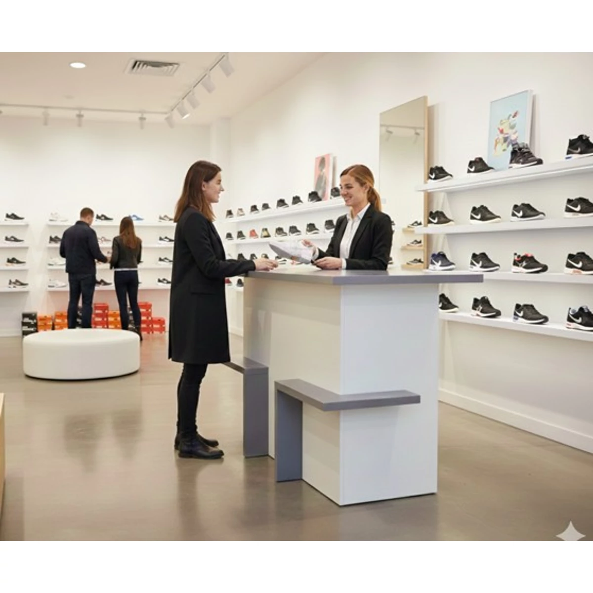 Egy nyíló, zárható ajtó egy polccal. Egy fehér, fémoldalas, zárható fiók. Egy nyitott polc. A pult fix.