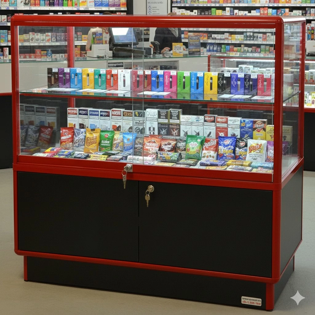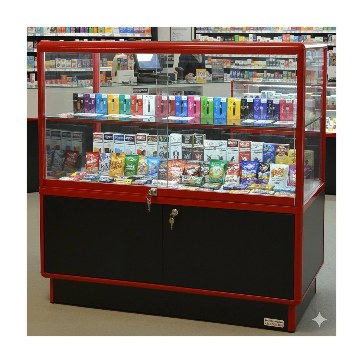 - Egy polcos, ketté osztott (525 mm vitrin belméret, 300 mm alsó tároló belméret) vitrin.